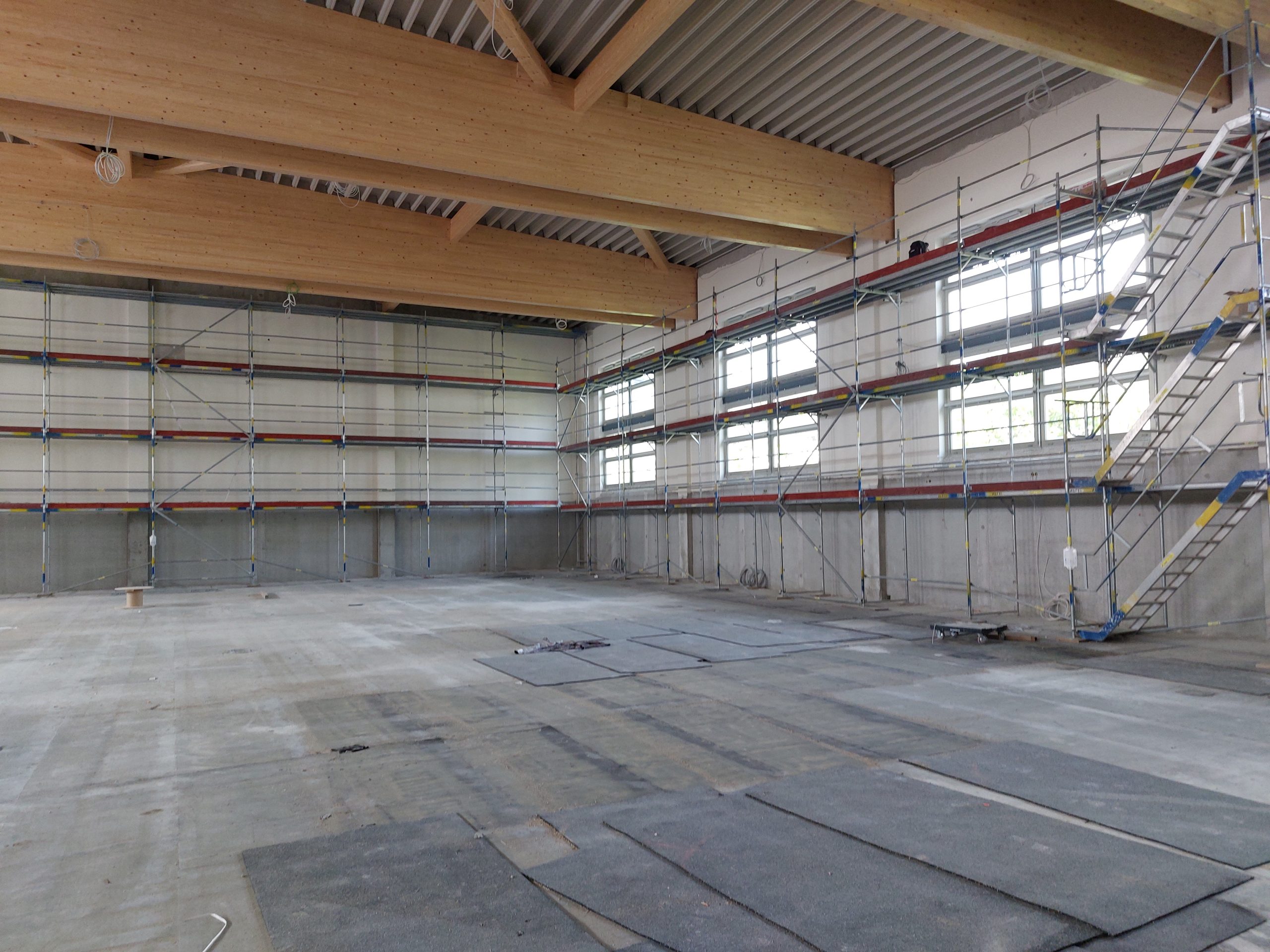Die 3-Feld-Sporthalle wird in einem ersten Bauabschnitt eingeschossig errichtet und so vorgerichtet, dass in einem zweiten Abschnitt ist die Aufstockung vorgesehen.