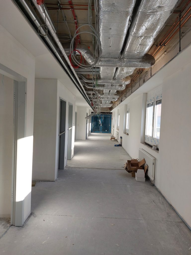 Der Ausbau erfolgte im Trockenbau mit abgehängten und akustisch wirksamen Decken, in denen sich die komplexe technische Gebäudeausstattung wie Lüftung, Sauerstoffversorgung und Glasfaserverkabelung befindet.